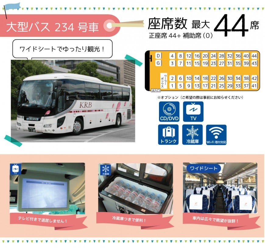 たとえば当店でご用意させていただける大型バスの一例がこちら ↑ 貸切バスなら他の人に気兼ねなく、グループ内で盛り上がれてバス内での飲食も自由に行えます。ご旅行人数に応じて、大型バス、中型バス、マイクロバス等のご手配が可能です。ゆったりお過ごしいただくためには、ご利用人数より少し大きめのバスをお薦めしておりますが、大型バスはサロンシート仕様のバスでご用意することも可能です。サロンシート仕様というのは、前方席は通常の4列シートですが後方席は真ん中にテーブルを置く形で、向かい合ってお席に座ることができるバスです。テーブルにはお飲み物が置けるドリンクホルダーもございますため、仲間内でお喋りをしながら楽しく移動時間を過ごすことができます。